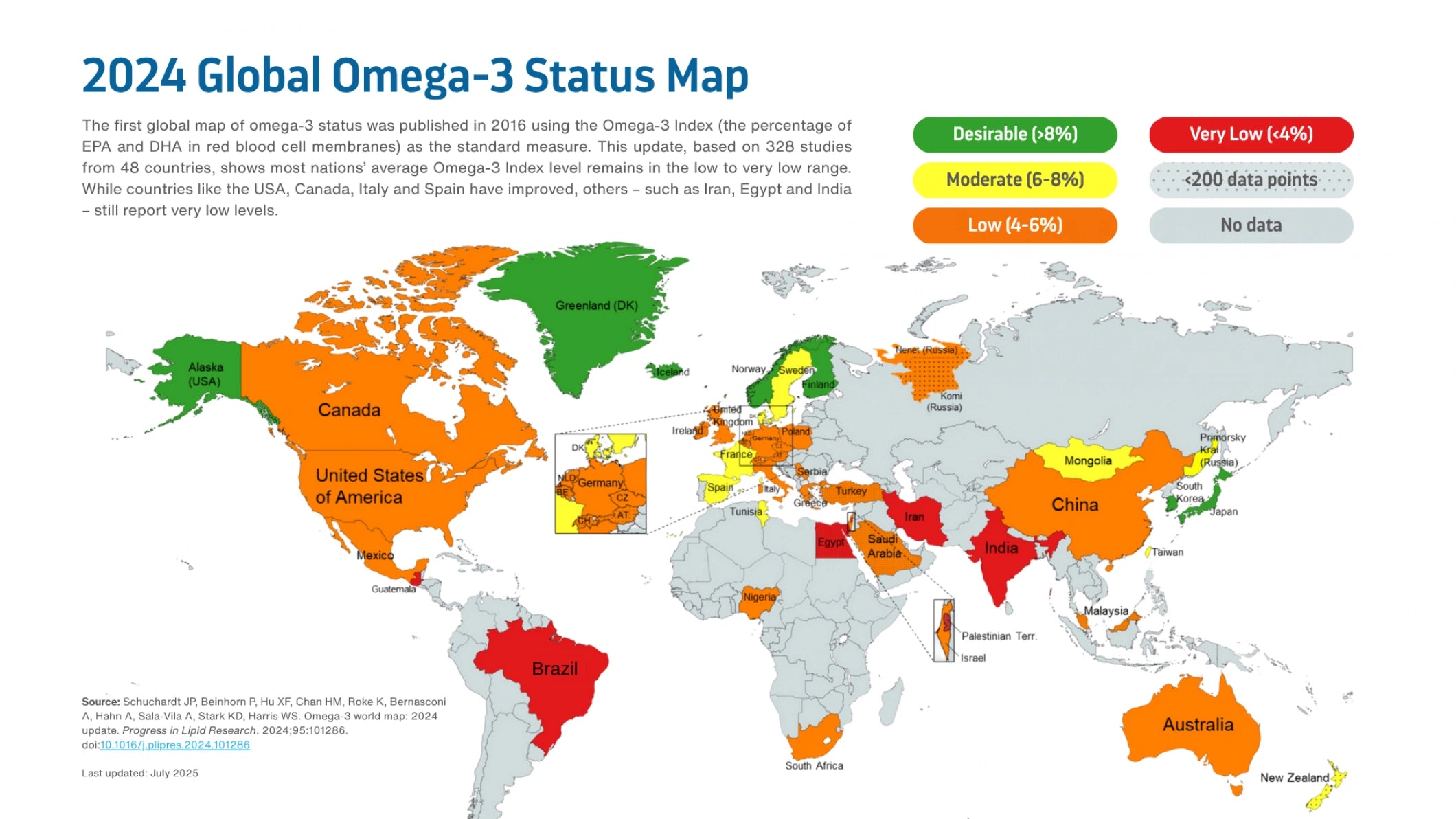 Die Studie ergab, dass der Omega-3-Spiegel in den meisten Ländern niedrig bis sehr niedrig ist. Diese Karte zeigt, wo die Mehrheit der Bevölkerung einen sehr niedrigen Omega-3-Spiegel im Blut hat.
