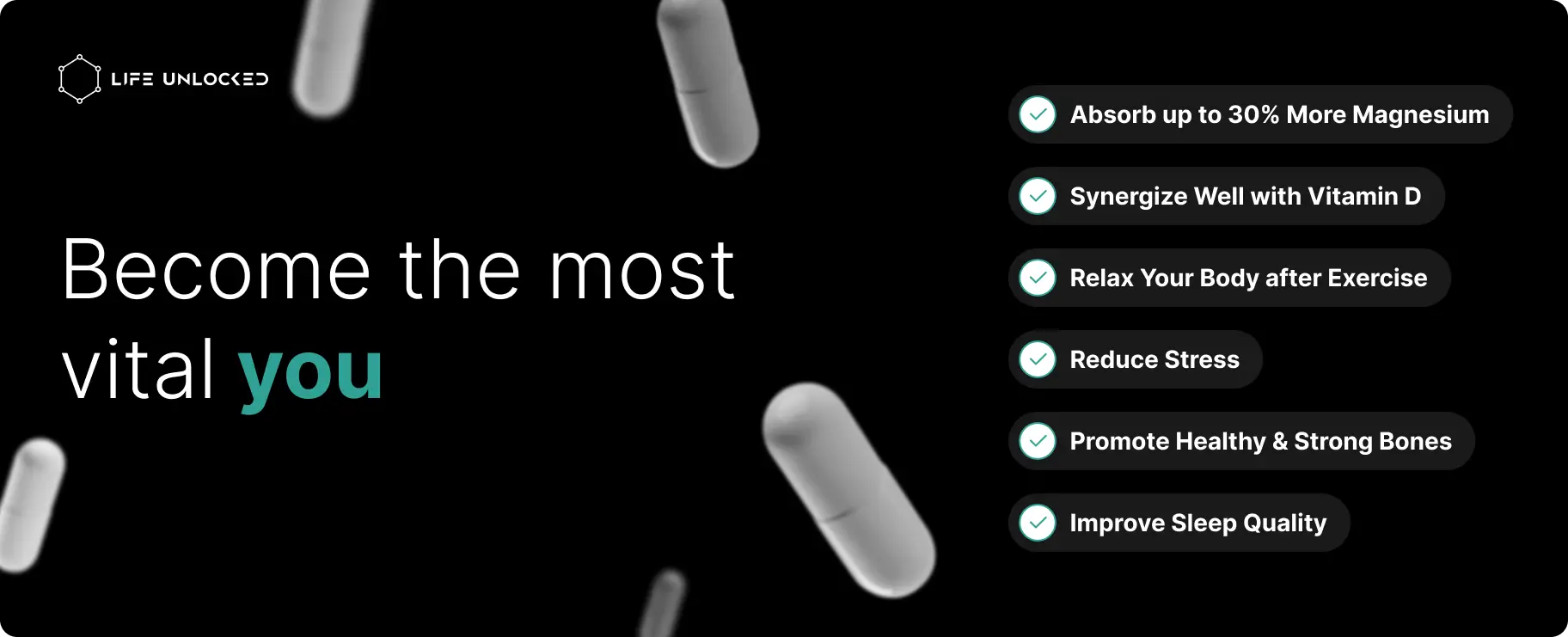 VITALITY bietet eine einzigartige Kombination aus 2 Arten von leicht absorbierbarem Magnesium + Vitamin D3 + Vitamin K2 in einer Kapsel, was die tägliche Einnahme erleichtert. Wenn Sie jede der VITALITY-Verbindungen in dieser Qualität einzeln kaufen würden, würde es mindestens das Doppelte kosten.